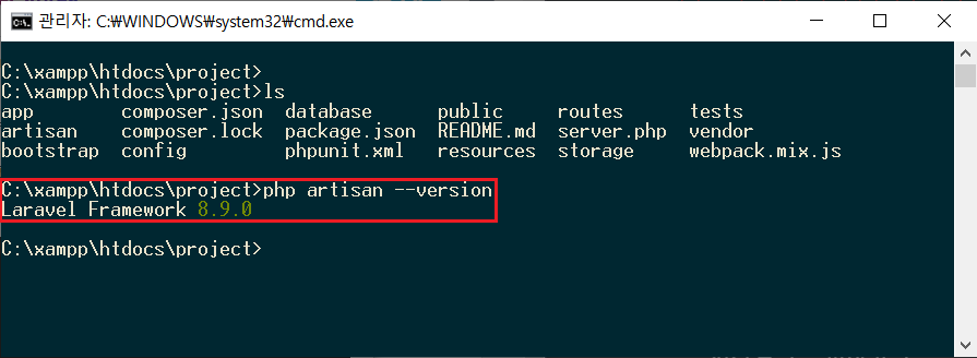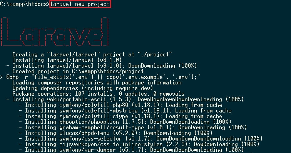 - $laravel new project : 라라벨에서 필요한 의존성 패키지들을 모두 설치 및 깨끗한 상태의 라라벨 파일이 포함된 project디렉토리 생성