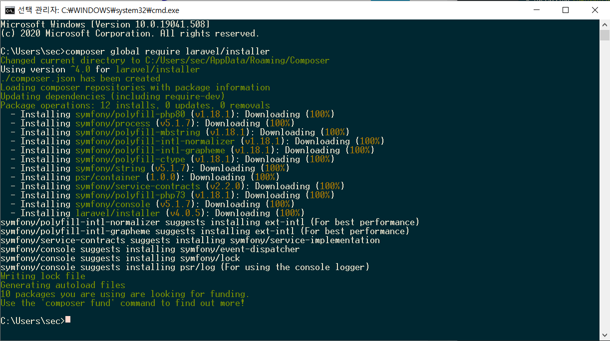 이제 Composer를 사용해 Laravel installer Download를 한다.