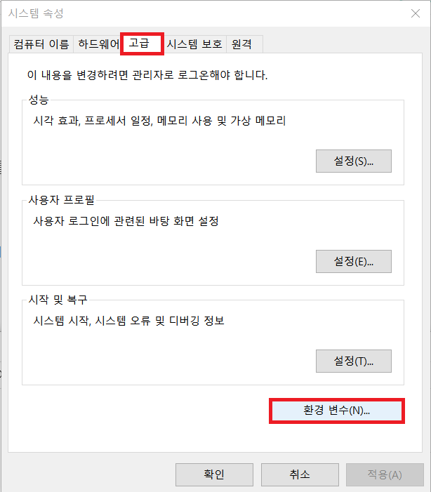 [제어판] → [시스템 및 보안] → [시스템] → [고급 시스템 설정]