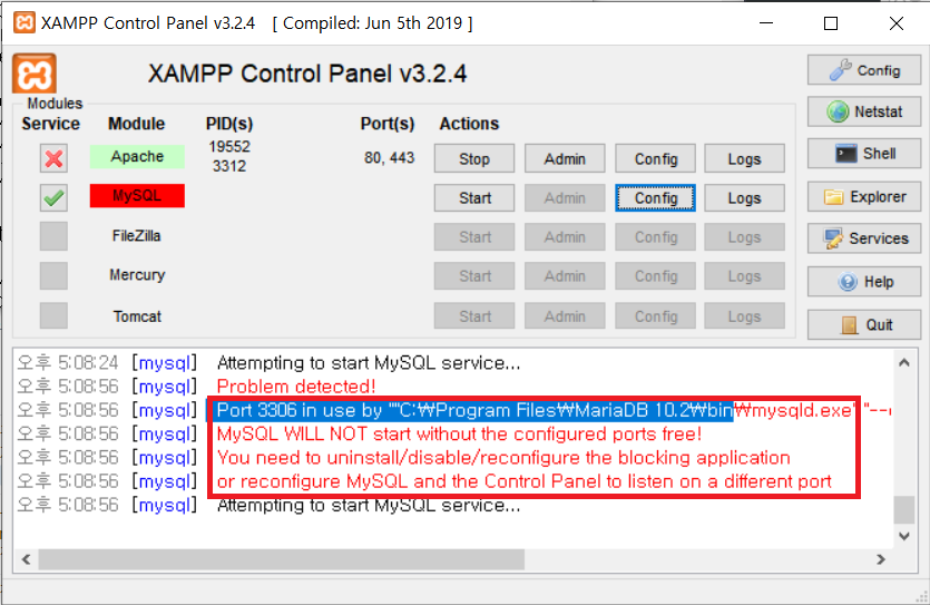 xampp를 설치하기전에 이미 MariaDB가 설치되어 있고 3306포트를 사용하고 있어서 충돌이 난 것 같다.
