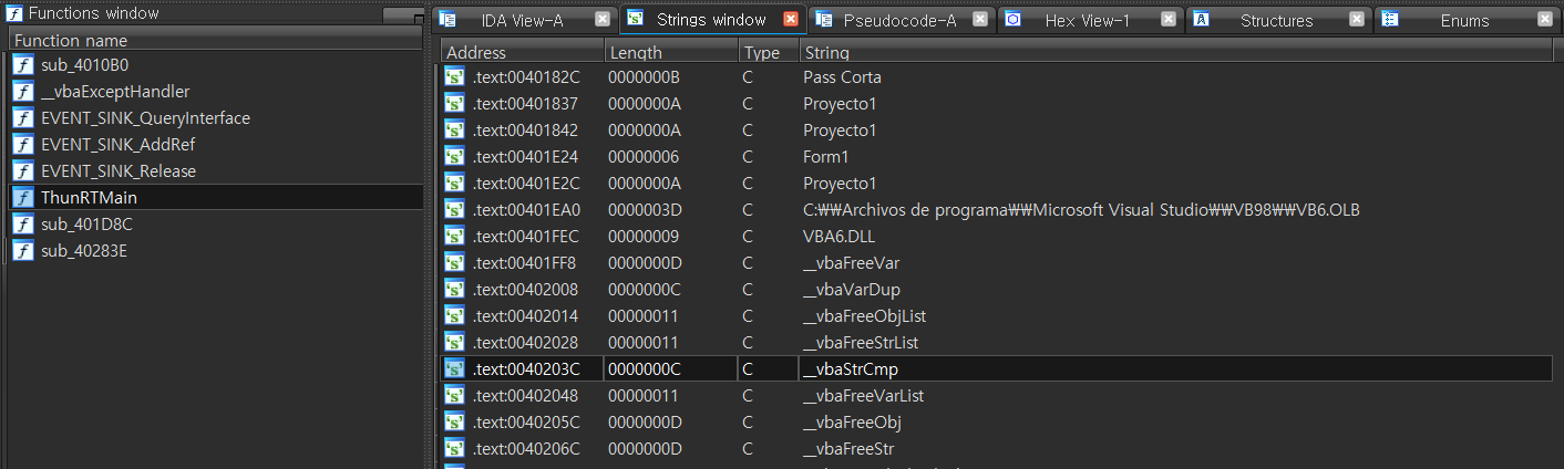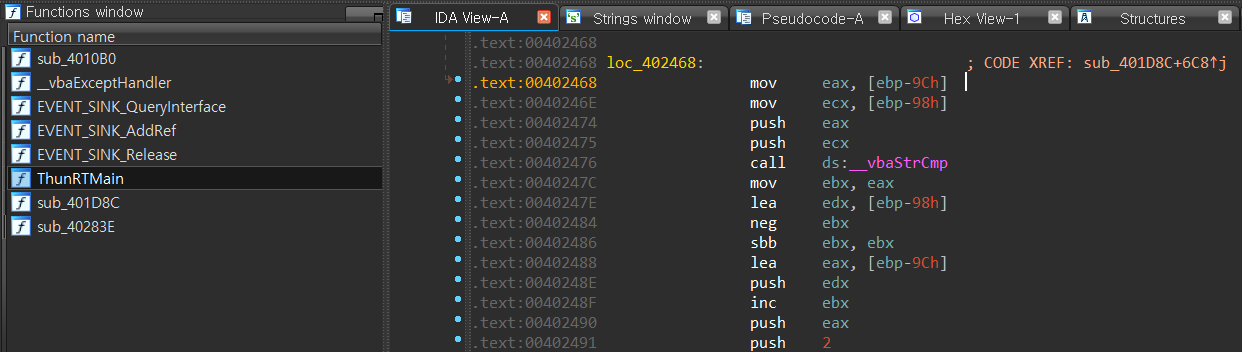 sub_401D8C()에서 __vbaStrCmp()가 사용된다.