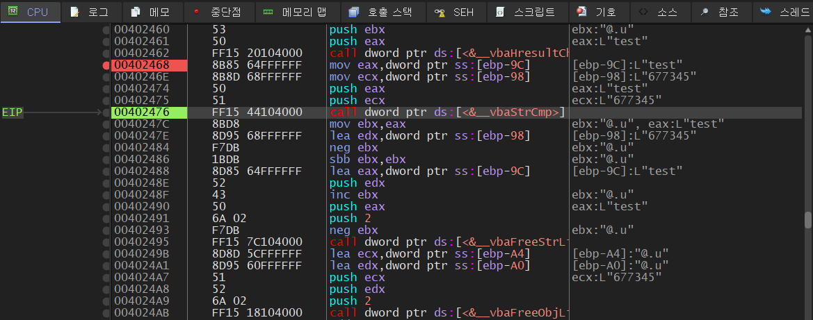 입력 값을 "test"로 주었을 때 __vbaStrCmp()의 인자로 입력한 값과 "677345"가 들어간다. 이후에 이를 통해 분기하므로 다시 "677345"를 입력하고 확인해보자