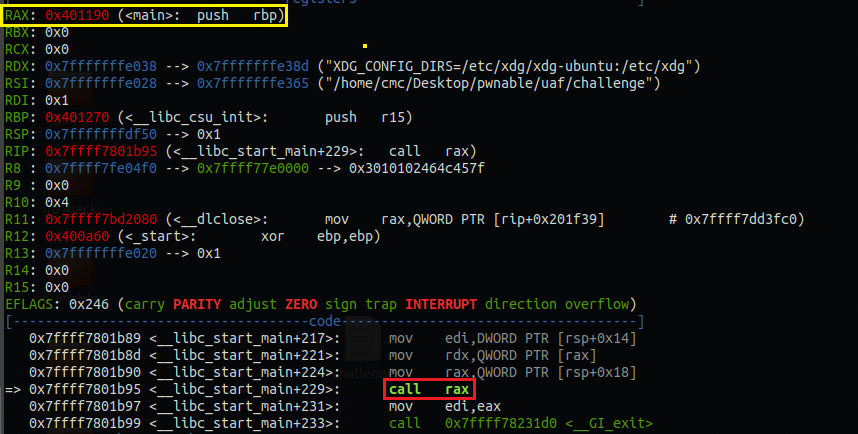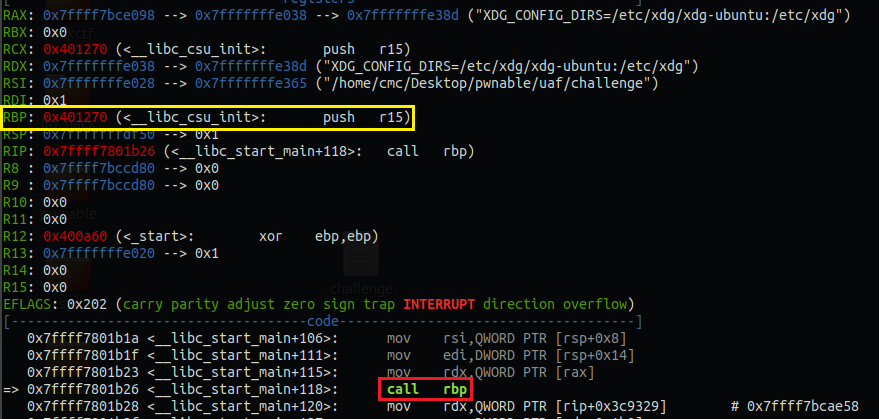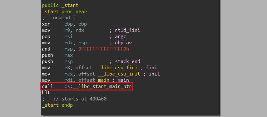 - _libc_start_main()을 호출하기 전에 필요한 인자들을 레지스터에 셋업한다.