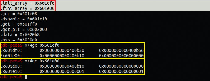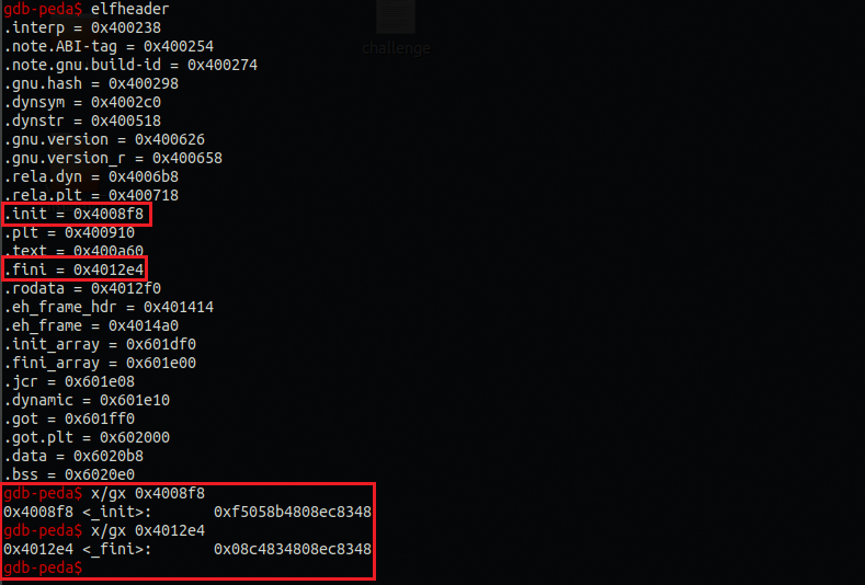현재 challenge파일에서 각 .init_array와 .fini_array에 저장된 함수들을 확인할 수 있다.
