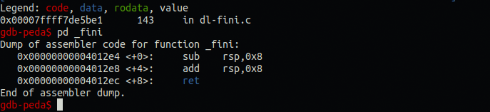 .fini_array배열에 있는 함수들을 호출하고 다시 _dl_fini()로 돌아와 _fini()를 호출하는 것을 볼 수 있다.
