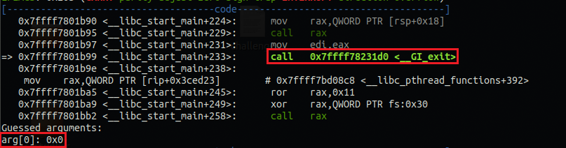 이 때, 파라미터로 0x0을 받는 것을 알 수 있는데 우리가 흔히 .c파일을 작성할 때 main() 마지막에 return 0; 으로 작성하는데 여기서 return값 0이 exit()의 파라미터로 들어가게 되는 것이다.