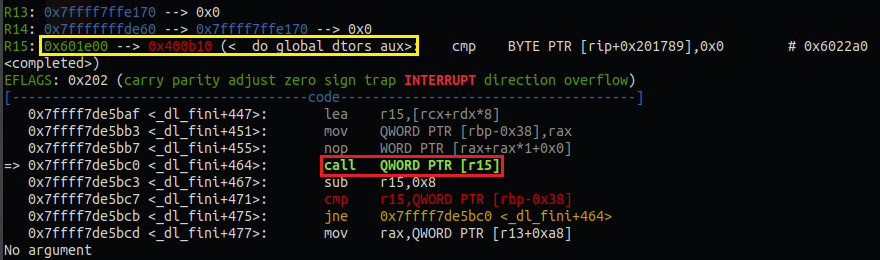 r15는 .fini_array섹션을 가리키며 .fini_array배열에 들어있는 __do_global_dtors_aux()를 호출하는 것을 확인할 수 있다.