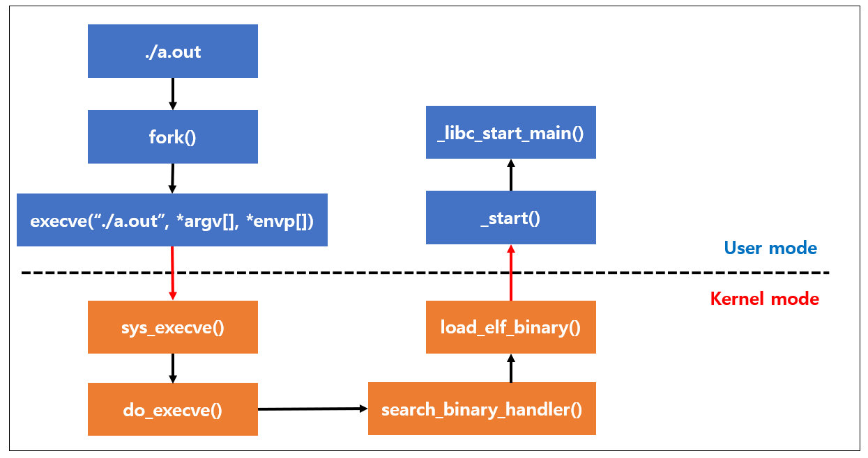 1) 쉘에서 ./a.out와 같이 elf파일을 실행시키면 새로운 프로세스를 fork