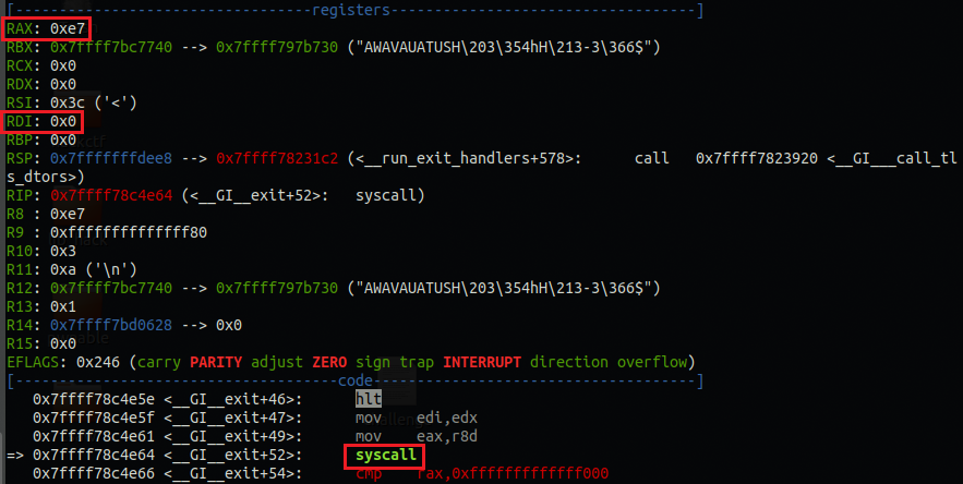 __GI__exit()에서는 rax값을 0xe7, rdi를 0x0으로 세팅하고