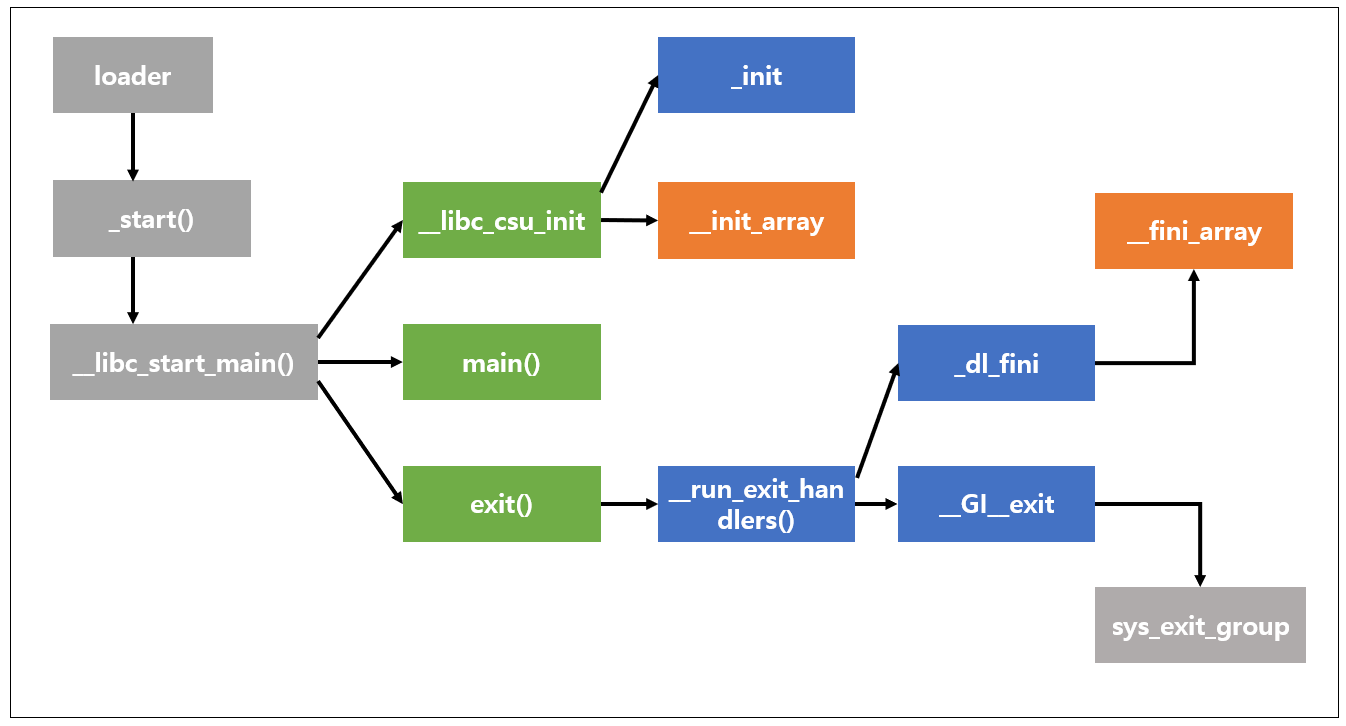 glibc에서 제공하는 crt1.o는 elf파일의 entry point인 _start함수를 구현하고 elf형식의 .init, .fini섹션을 지원한다. 참고로 gcc 4.7 이상 버전부터 .ctors(constructor), .dtors(destructor)대신에 .init, .fini를 사용하고 이들은 main함수 호출 직전 및 종료 후에 실행되는 생성자, 소멸자이다. (.init / .fini섹션에 관련된 작업은 __libc_csu_init, fini함수에서 처리)