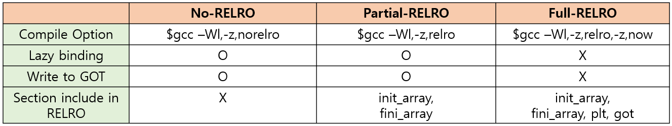 GOT Overwrite와 같은 공격에 대비해 ELF 바이너리 또는 프로세스의 데이터 섹션을 보호하는 기법이다. 바이너리 컴파일 시 Full-RELRO 옵션을 주면 .ctors, .dtors, .jcr, .dynamic, .got섹션이 Read-Only가 됨 → GOT Overwrite 불가능