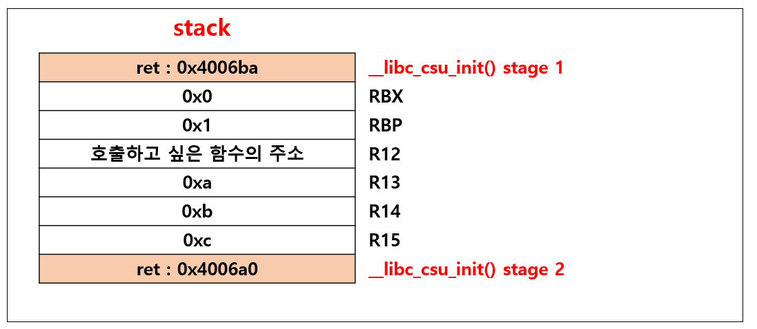 ret를 주작하여 __libc_csu_init()의 다음 루틴으로 이동했을 때 상황이다.