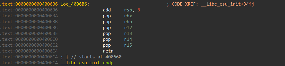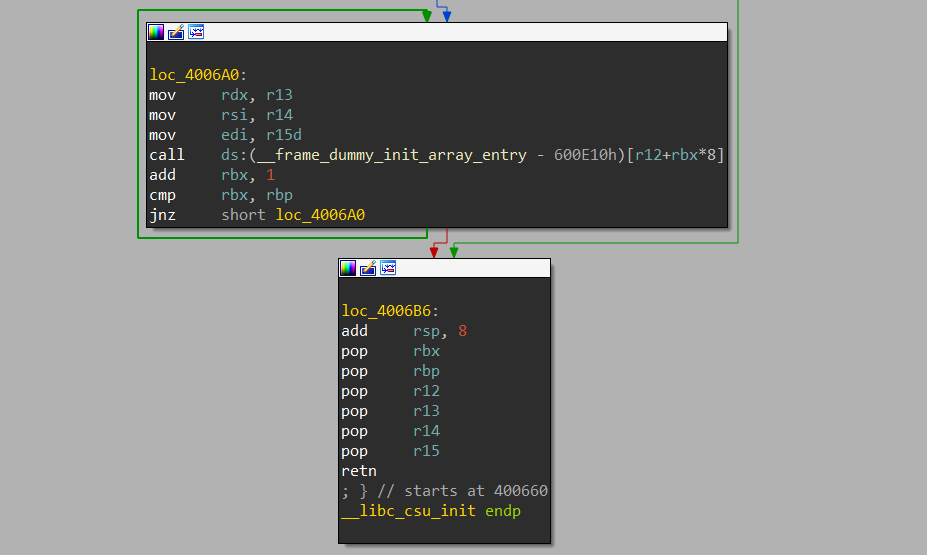 위 참고 자료를 보면 알 수 있듯이 __libc_csu_init()에서는 __init_array에 설정된 함수 포인터를 읽어서 호출하는 과정이 있는데 이 부분을 이용하여 rsi, rdi, rdx를 쉽게 구성할 수 있다.