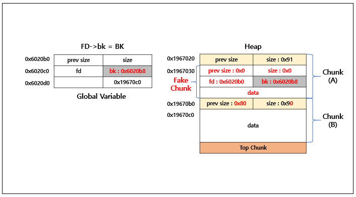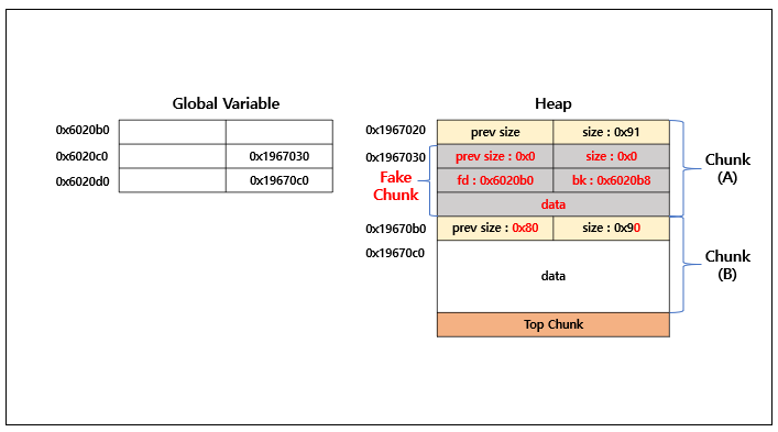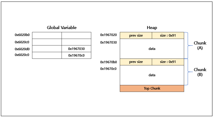 전역 변수에서 heap영역을 관리하게 되는데 처음에 0x6020c8주소에 Chunk(A)의 주소 값이 존재했으나 위 과정을 통해 마지막 사진에서 0x6020c8주소에 0x6020b0을 가리키게 된다.