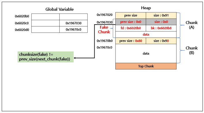 chunksize(P)와 prev_size(next_chunk(P))값이 같지 않으면 참이 아님