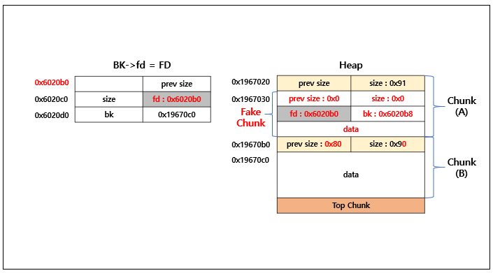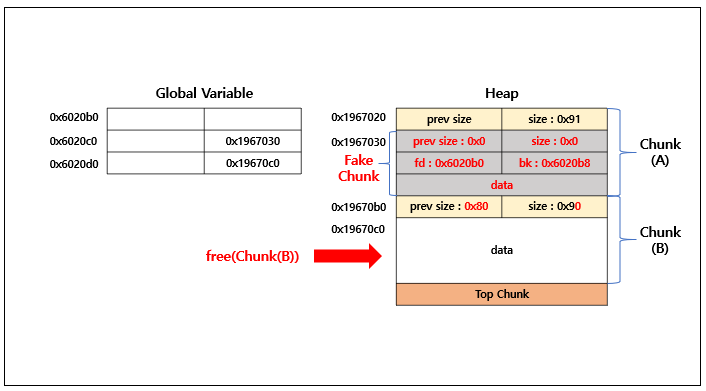 Chunk B를 free하게 되면서 P비트를 확인했을 때 0x0인 것을 확인하고 인접한 Chunk인 Fake Chunk가 free된 Chunk임을 알 수 있다.