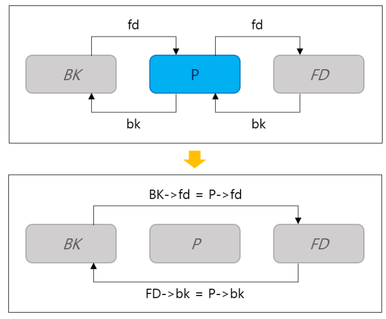 BK→fd (p→bk→fd) : 이전 Chunk의 다음 Chunk, 결국 본인(P)