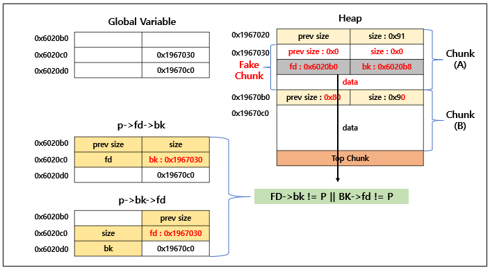 위 코드에서 보면 Unlink가 수행되기 전에 2번의 if문을 통해 double-linked-list가 손상되었는지 검증을 하게 되고 검증이 통과하면 FD→bk = BK, BK→fd =FD를 수행한다.