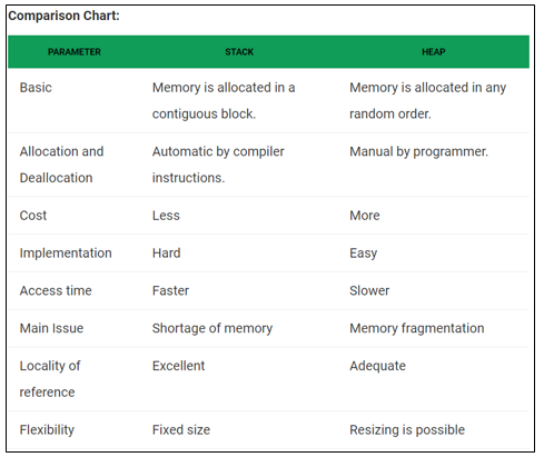 스택 영역과 비교하였을 때 속도면이나 비용문제에서 스택을 사용하는 것이 성능면에서 우수하며 힙은 스택과 달리 메모리를 직접 관리(메모리 할당 및 해제)를 해줘야하지만 스택 영역은 힙 영역에 비해 메모리 공간이 부족하며 할당해야 할 메모리 크기를 프로그램이 실행하는 동안 결정해야 하는 경우 힙 영역을 사용한다.