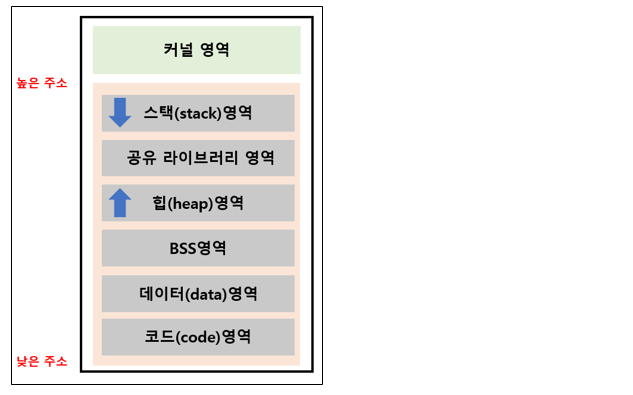 이 때, 할당된 메모리 공간에는 다양한 영역이 존재하며 사용되는 용도가 다르다. 여기서 할당된 메모리 공간에는 코드(code, 또는 text)영역, 데이터(data)영역, 스택(stack)영역, bss영역, 힙(heap)영역으로 구분된다.