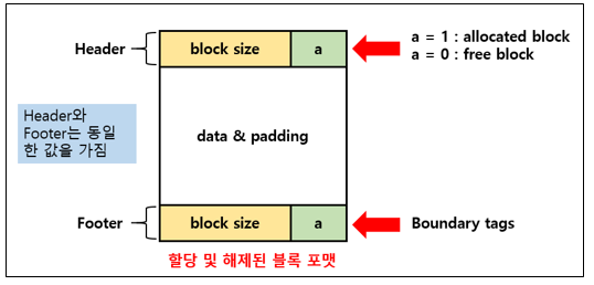 Boundary tags : 해제된 블록의 끝에 헤더 정보를 복사하여 블록을 반대 방향으로도 따라갈 수 있게 함