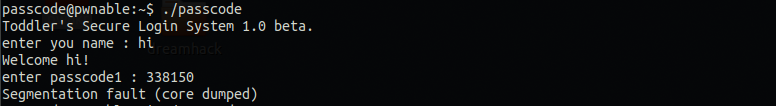 근데 passcode1에 입력할 때 segmetation fault가 발생한다.