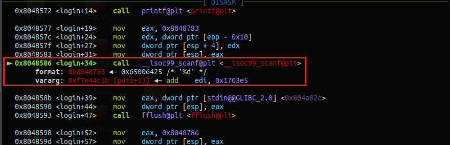 두 번째 scanf가 실행하기 전에 printf가 실행되니깐 printf@got Overwrite를 하자. 그리고 원래 목적은 system("/bin/cat flag");을 실행시키는거니깐 printf@got에 login()의 코드영역에 있는 system("/bin/cat flag")를 실행시키는 주소 값을 넣자