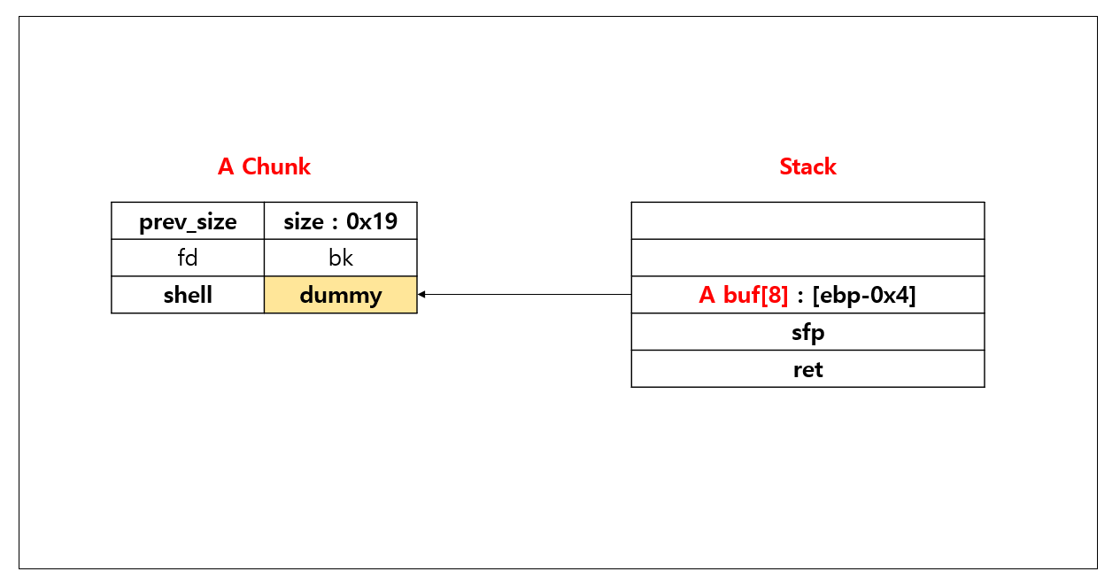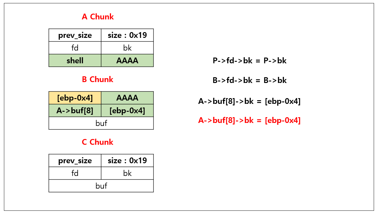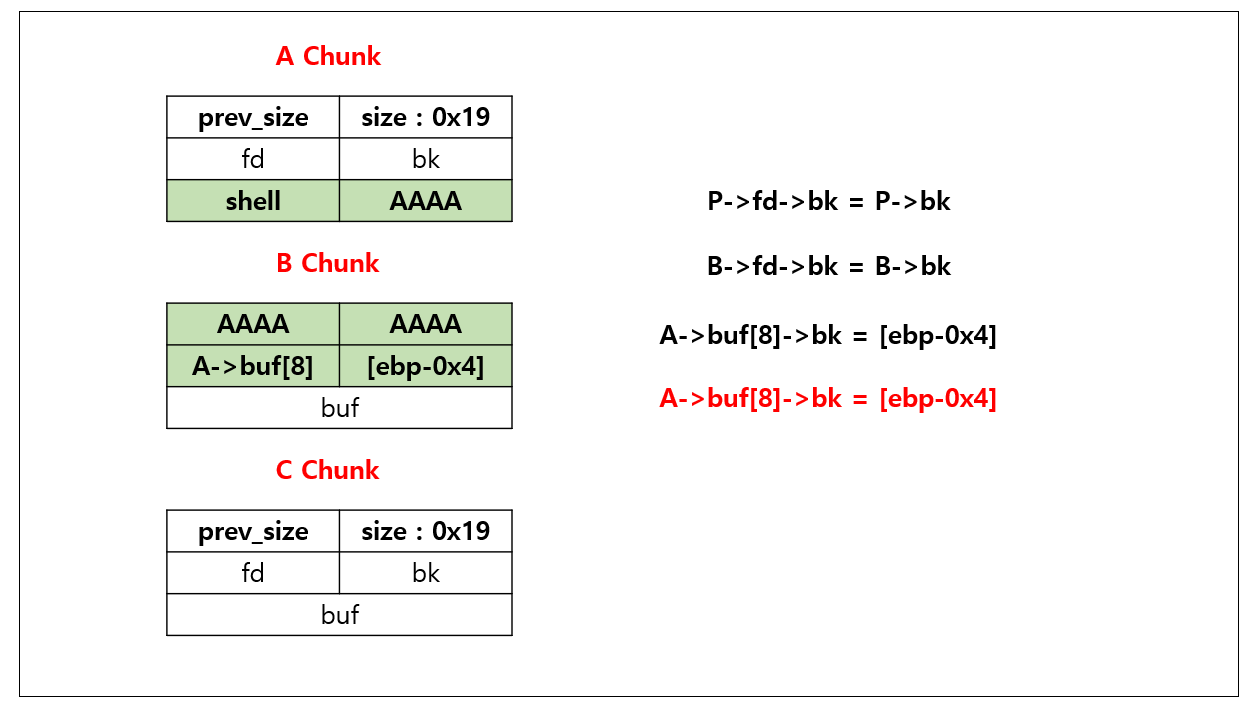 결국엔 B→bk에는 ebp-0x4 주소를 넣으면 되고 P→fd에는 A→buf[8]을 넣으면 된다.