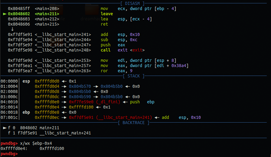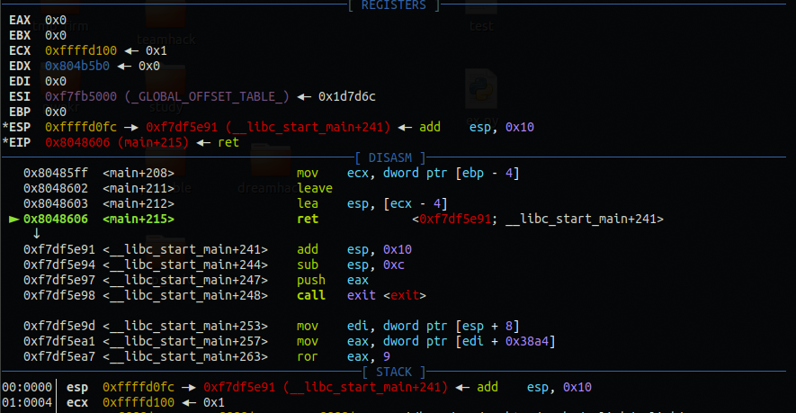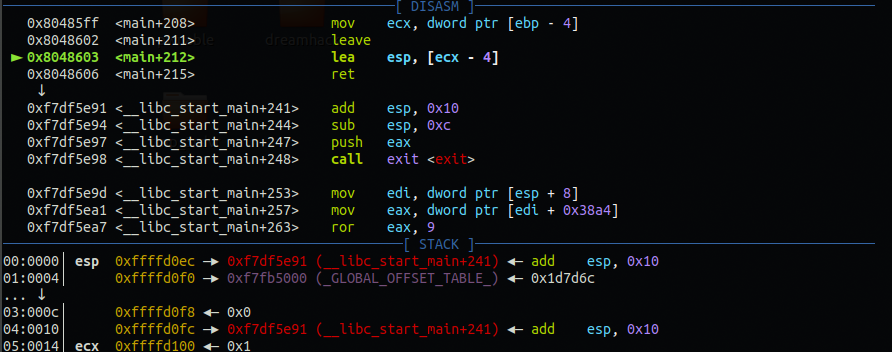 마지막으로 lea esp, [ecx-0x4]를 실행하게 되면서 ecx-0x4의 주소 값인 0xffffd100-0x4 = 0xffffd0fc를 esp에 넣는다.