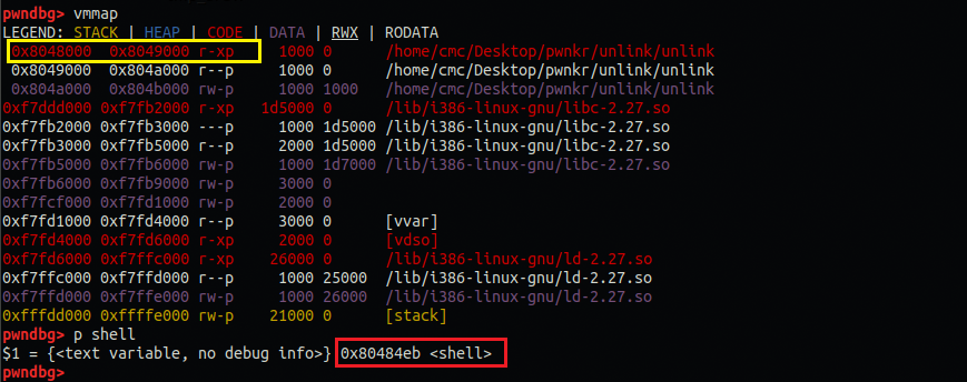 하지만 만약 위의 첫 번째 방법으로 하면은 ret에 shell address를 넣을 수 있으나 그 다음 행인 P→bk→fd(shell + 0x4)에다가 P→fd값을 넣게 되는데 이 때, shell()은 code영역이며 write권한이 없어 불가능하다.