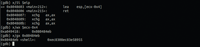 lea esp, [ecx-0x4]하고 ret하면 shell() 실행할 수 있음